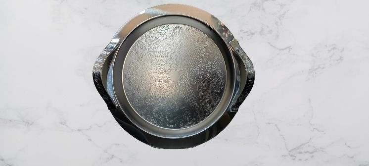 سینی استیل سیلا گرد گلدار دسته لوزی کد 804