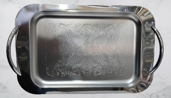 سینی استیل سیلا مستطیل بزرگ گلدار دسته لوله ای کد 101