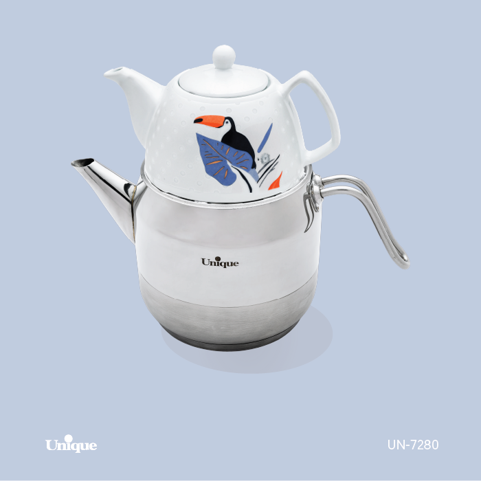 کتری استیل لوله دار با قوری چینی یونیک